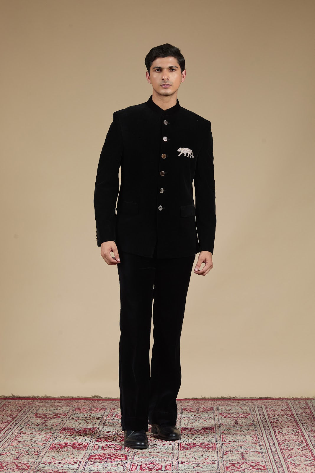 Elevate your ethnic wardrobe with this luxurious velvet Jodhpuri suit, adorned with intricate jacquard motifs that exude royal charm. Featuring a traditional bandhgala neckline and a structured silhouette, this ensemble is tailored for sophistication. Paired with matching pants, it’s perfect for weddings, receptions, or formal festivities where timeless elegance is key.