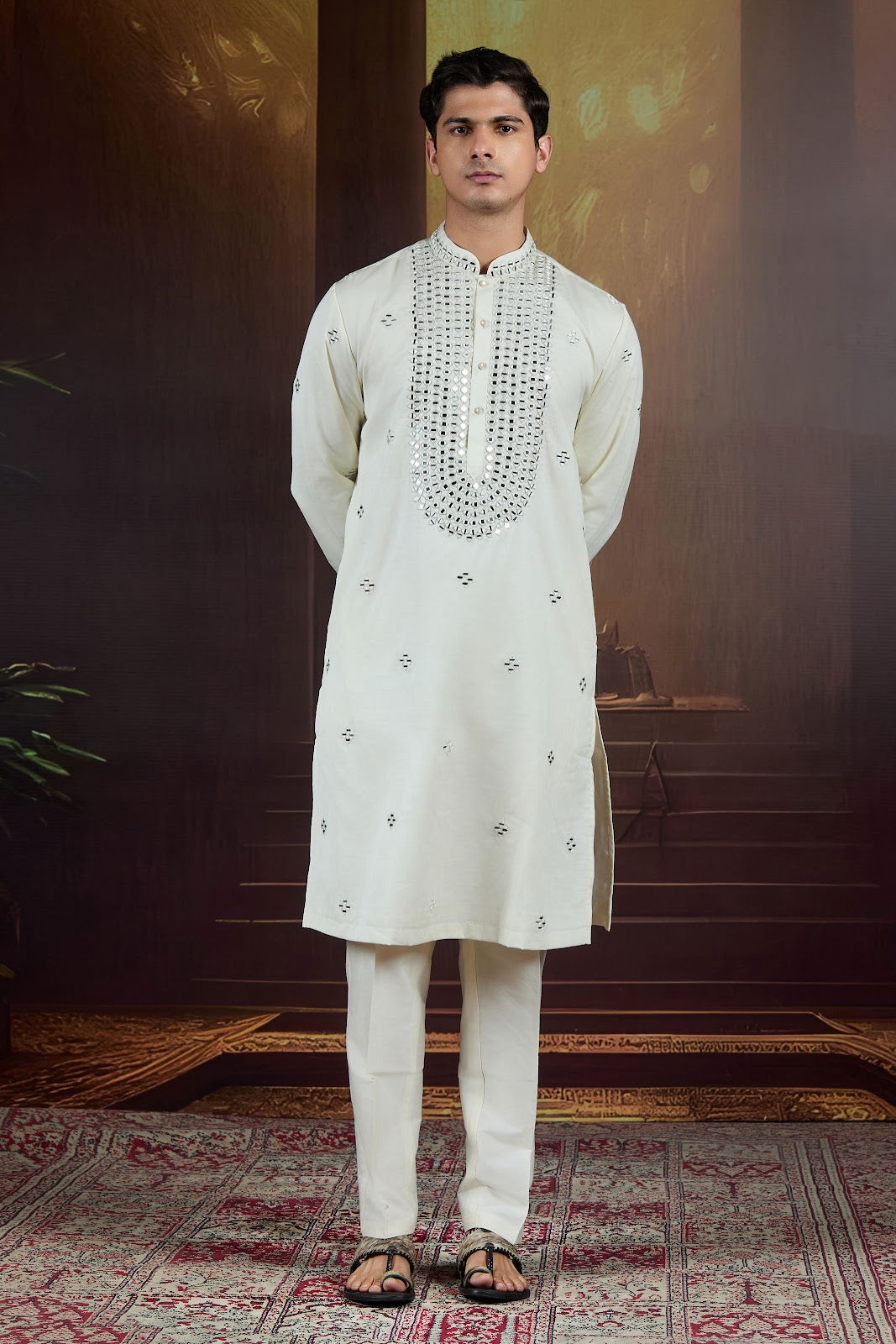 A refined blend of Eastern embellishment and European tailoring. This off-white bundi set dazzles subtly with cutdana pearl work and a tailored kurta base. A timeless silhouette for intimate mehendis or family rituals.