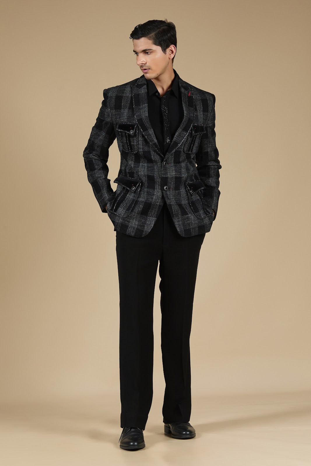 A gentleman’s signature, redefined. This black and grey suit features a timeless check pattern with a woolen finish that balances warmth with modern elegance. Paired with a classic black shirt and straight-fit trousers, it's your answer to effortless sophistication for cocktail soirées or winter weddings.