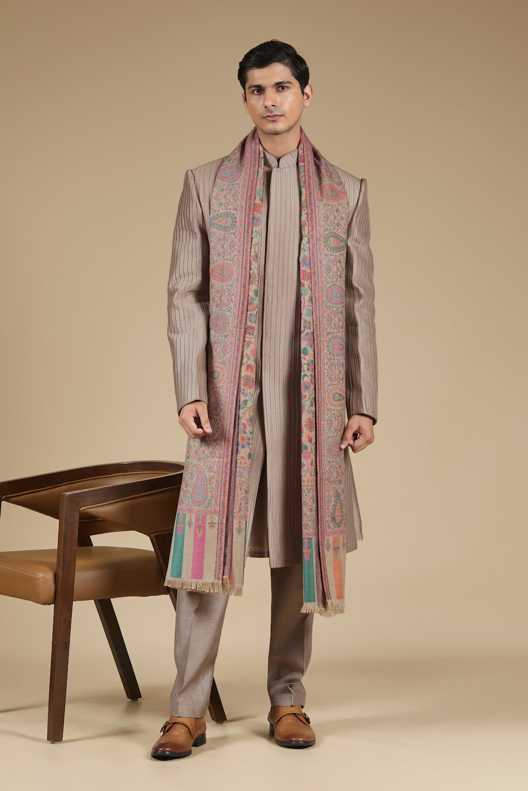 Where grace meets grandeur. This kurta set comes with a finely tailored jacquard sherwani layered over a tonal kurta-pant set. Styled with an ornate stole, it’s a timeless look rooted in heritage, designed for grooms or anyone dressing for a once-in-a-lifetime event.
