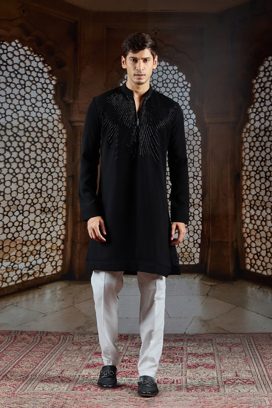 Chiseled in black and highlighted with intricate handwork around the neckline, this kurta set is an ode to midnight silhouettes. Structured yet fluid, it balances edge and elegance — perfect for receptions, post-sundown mehendis, or a festive sangeet look that makes a bold impression.