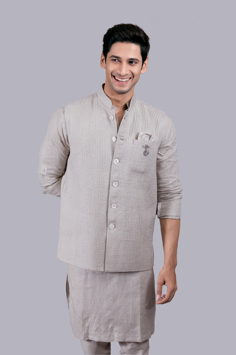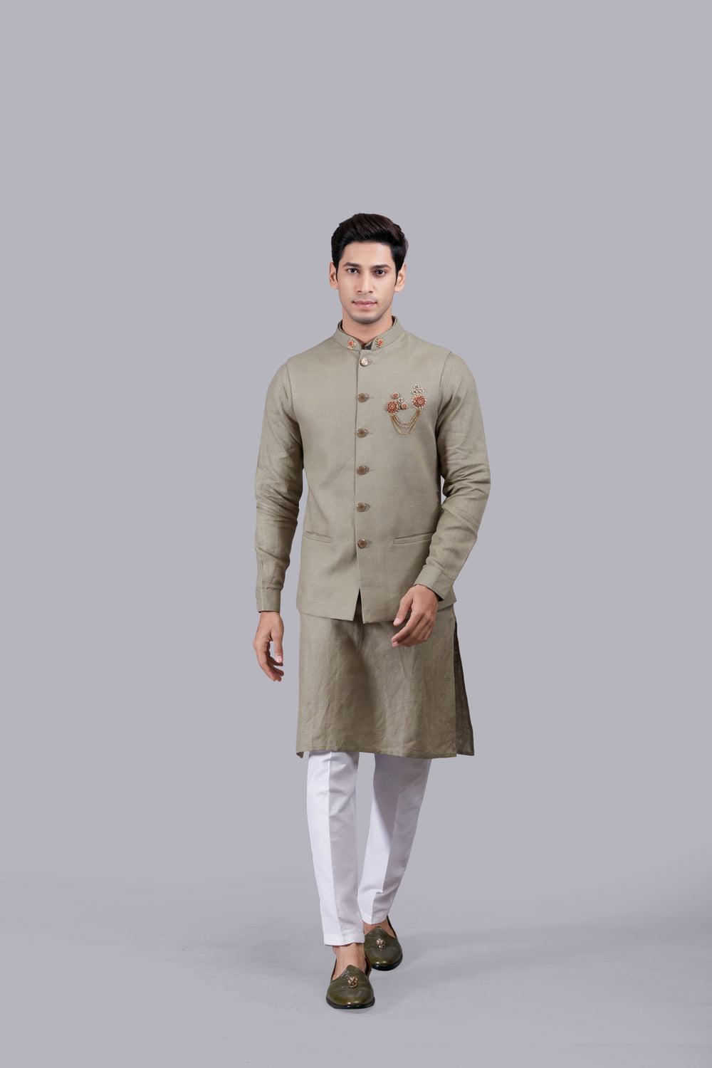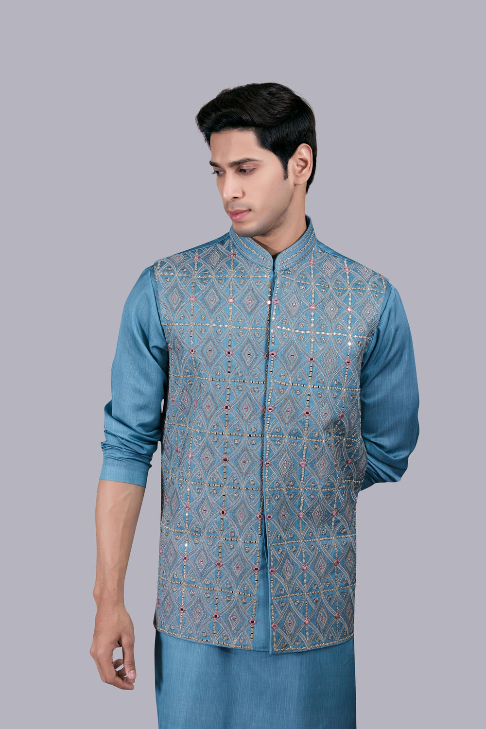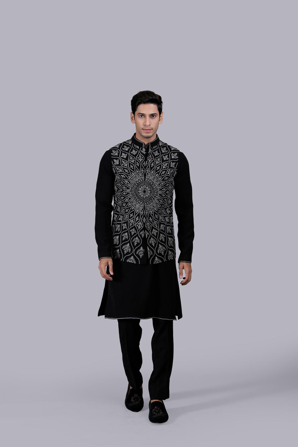 Pair your kurta with a beautifully tailored Bundi jacket to complete the look. A kurta with Bundi adds that extra layer of charm and tradition, perfect for creating an impressive look without overdoing it. Whether you’re the groom, a guest, or hosting a family event, this set helps you stand out for all the right reasons.